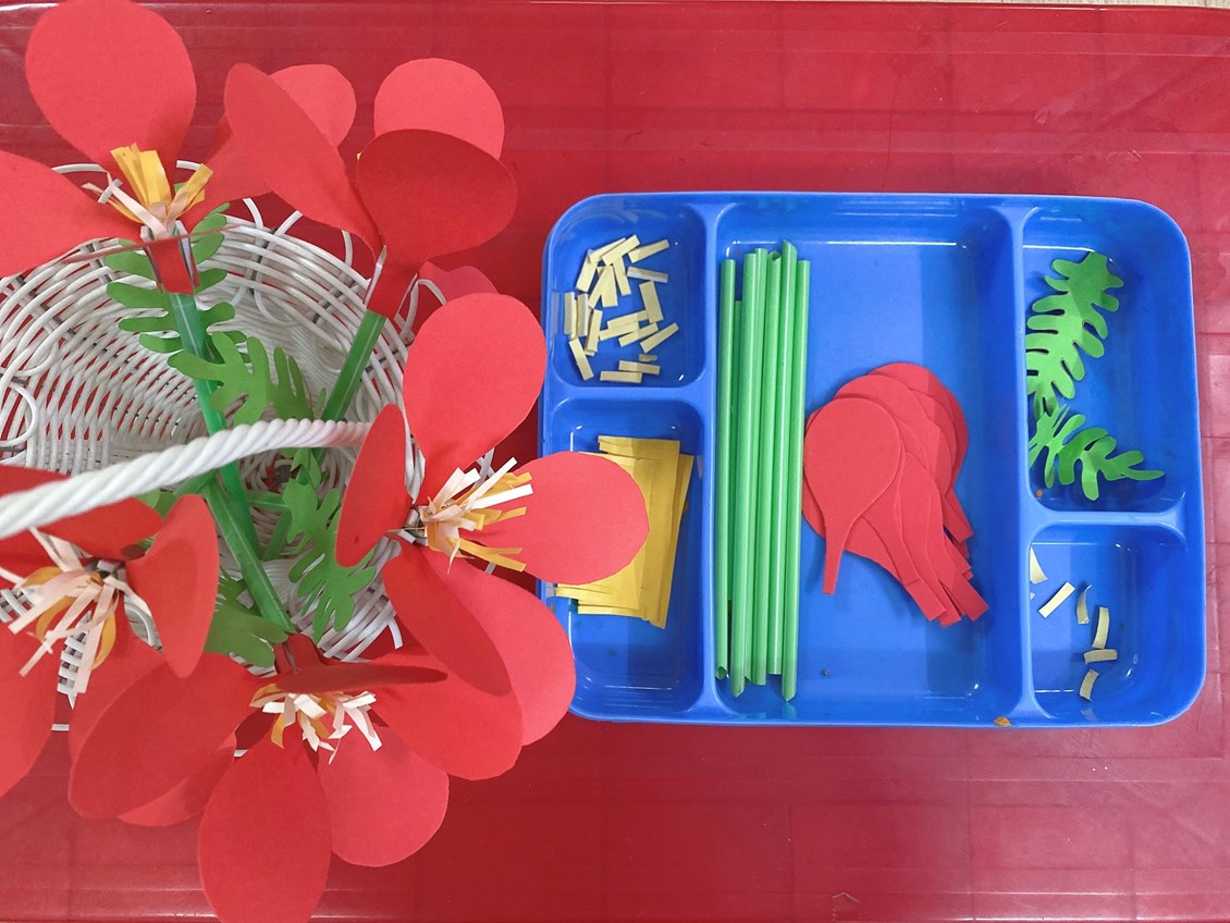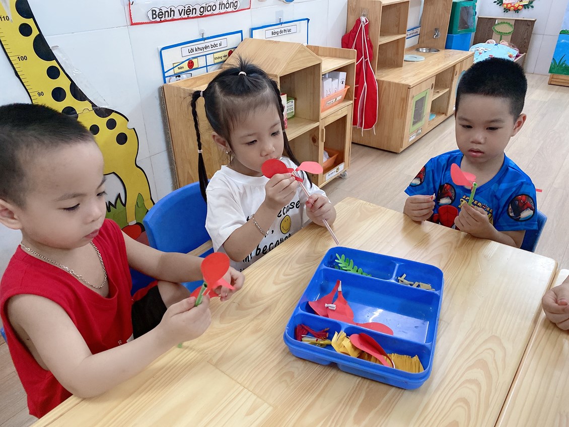 Từ những nguyên vật liệu đơn giản như “giấy màu, ống mút, băng dính xốp …” các con đã dán được những bông phượng đỏ rất xinh xắn 🥰