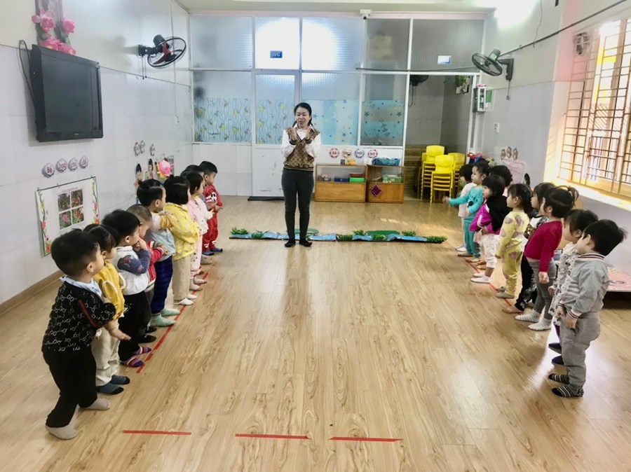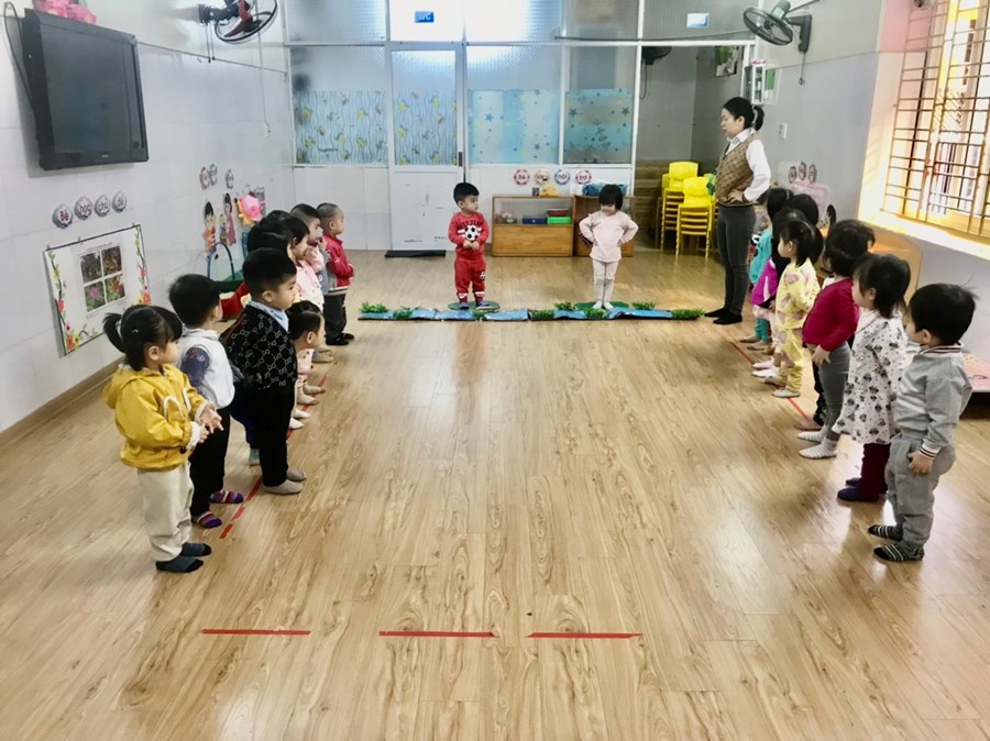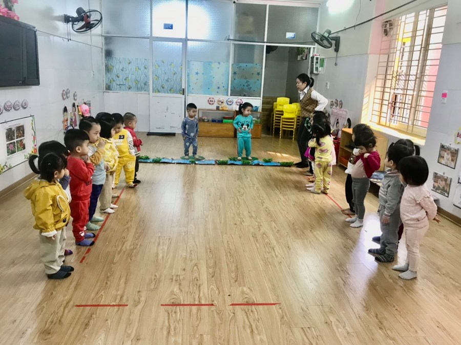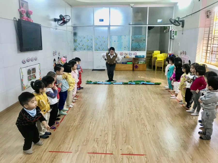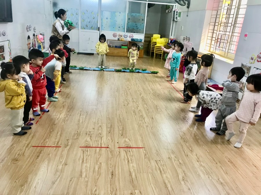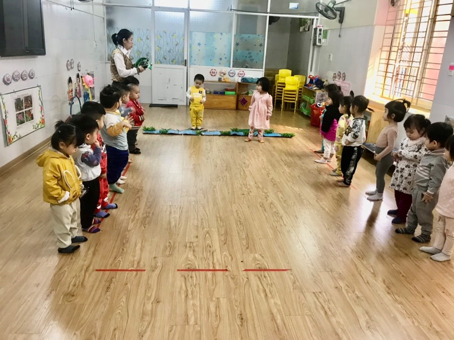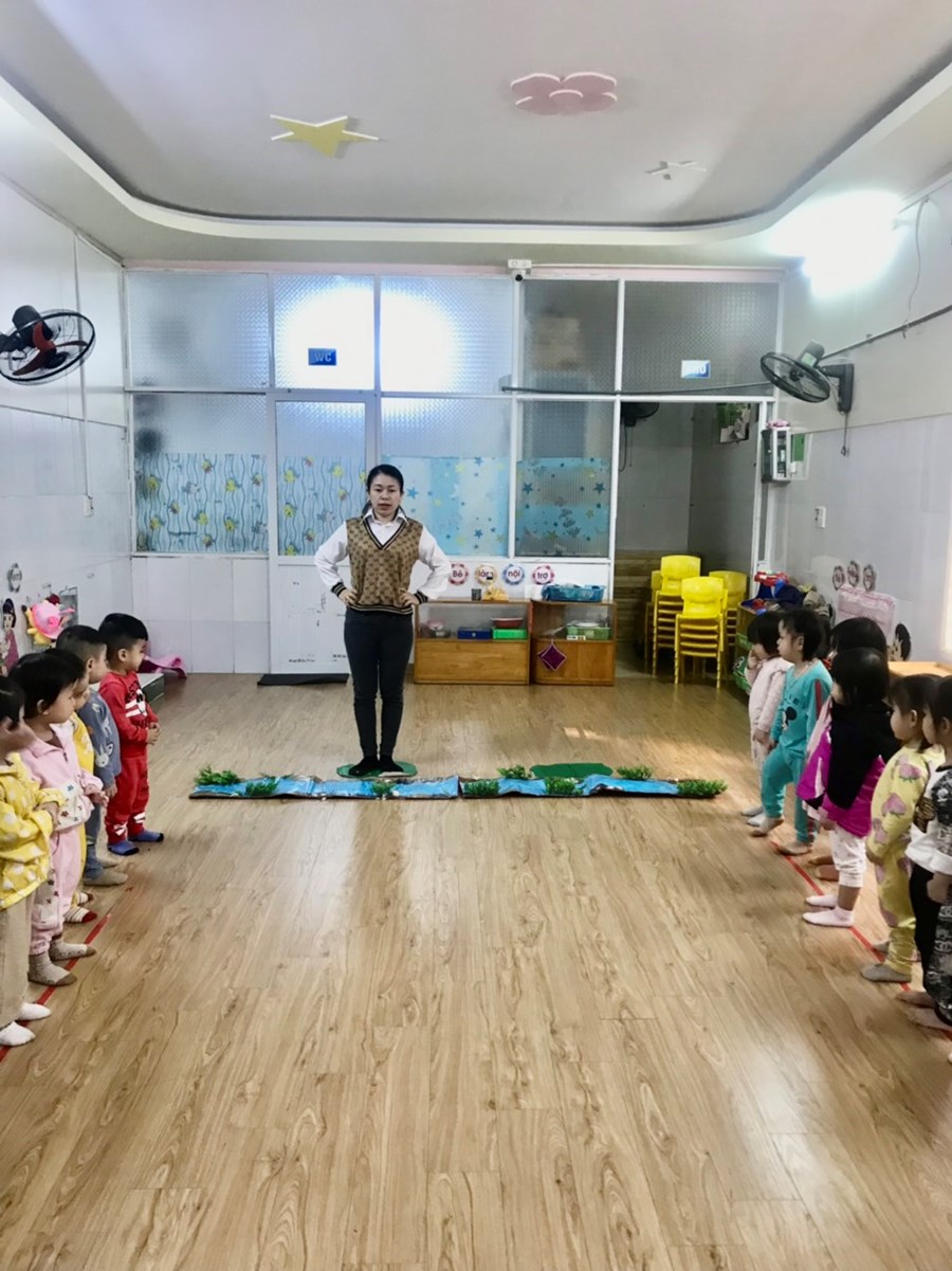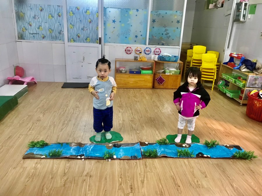 Sau đây là một số hình ảnh của các bé lớp cơm thường qua bài tập "Bật qua suối".