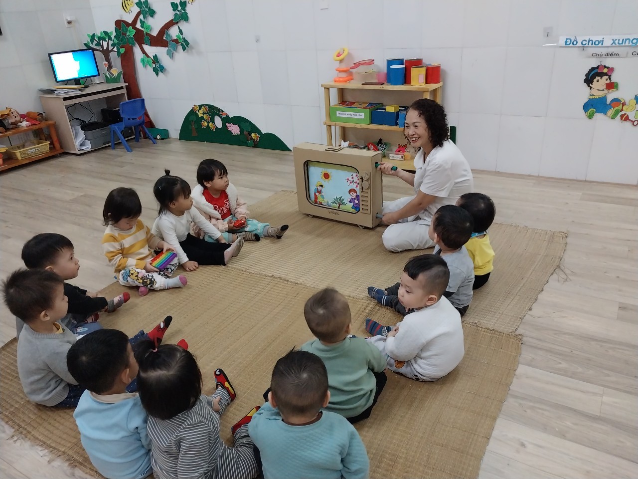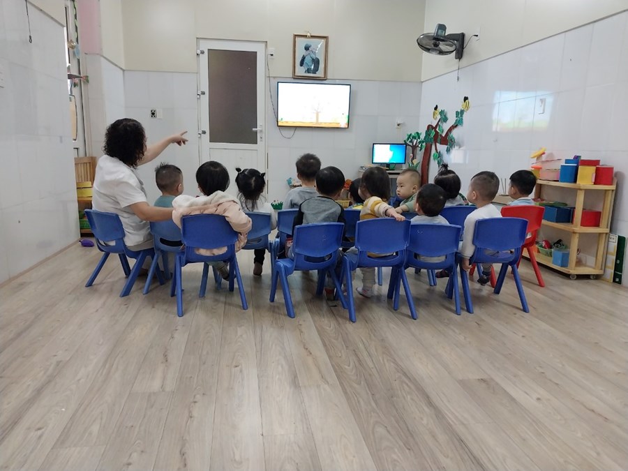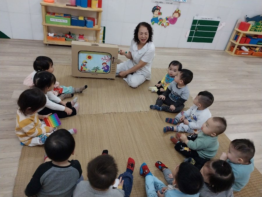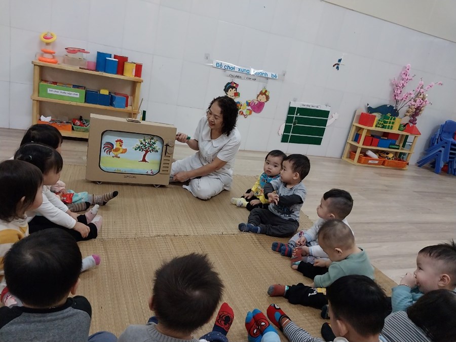Ngôn ngữ giúp trẻ tìm hiểu, khám phá, nhận thức về môi trường xung quanh và hoạt động kể chuyện có vai trò quan trọng đặc biệt đối với sự phát triển ngôn ngữ cho trẻ nhất là trẻ nhà trẻ. Hiểu được tầm quan trọng của việc phát triển ngôn ngữ như vậy nên giáo viên chúng tôi luôn quan tâm đến việc phát triển ngôn ngữ cho trẻ thông qua các giờ học kể chuyện. Dưới đây, là một số hình ảnh trong giờ học truyện: Cây táo" của các bé lớp Cơm nát: